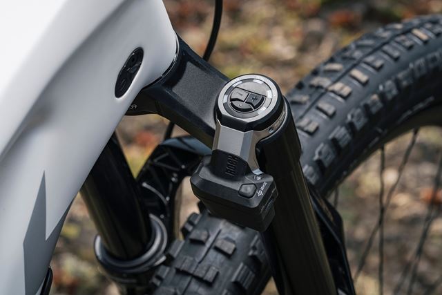 Der Dreh- und Angelpunkt ist das Flight Attendant-Controlmodul an der Gabel. Dieses sammelt die Daten der Sensoren von Hinterbau und Kurbel, analysiert Trail- und Fahrerinput und steuert die Flight-Attendant-Komponenten. Das Controlmodul befindet sich am rechten Standrohr – und damit in Reichweite, um auch während der Fahrt Einstellungen und Feinabstimmungen vorzunehmen. Zudem gibt es einen linken 2-Tasten-AXS-Controller, mit dem der Fahrer zwischen den Fahrwerksmodi wählen oder auch die Reverb AXS-Stütze bedienen kann.
