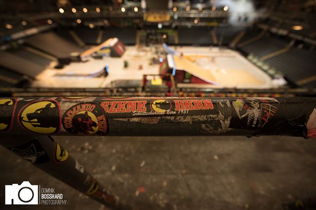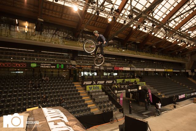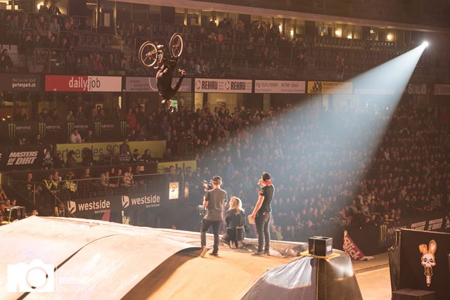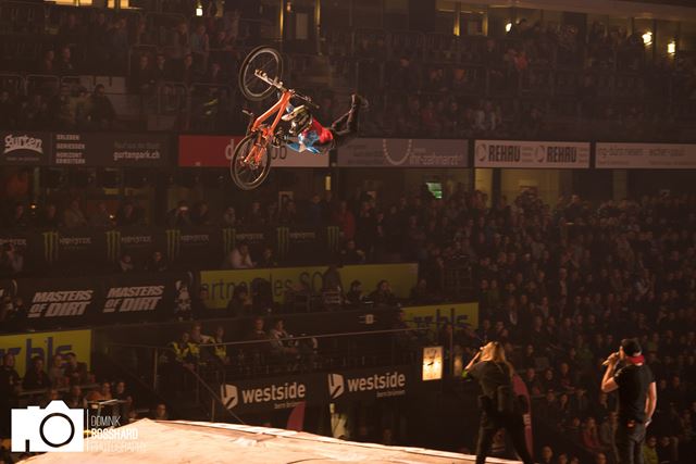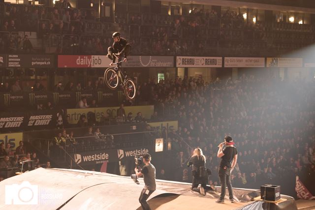 Die erste Stunde konnte ich also die waghalsigen Sprünge von Jose, Massimo, Alastair und Co. bestaunen. Nach einem kurzen Aufwärmen während der Pause war es also soweit: mein Auftritt am Masters of Dirt in Bern. Das Publikum war richtig gut drauf und wartete gebannt auf unsere Sprünge.