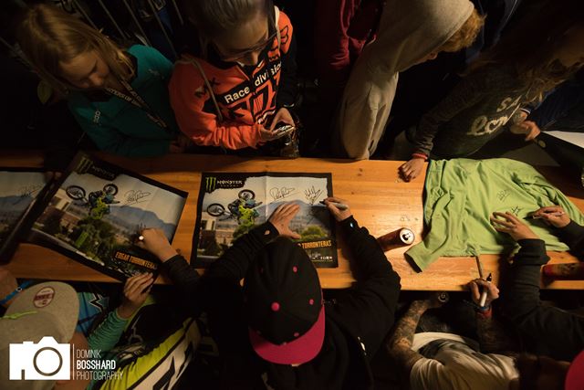 Danach kam die explosive Pyro-Show der Fuel Girls und der zweite Teil der FMX Show zusammen mit Quad und Schneemobil. Am Ende stürmten wir alle auf den Track um gemeinsam die grossartige Show zu feiern. Alle standen total unter Strom, die Stimmung einfach unbeschreiblich. Nach einem kurzen Gruppenfoto stand auch schon die Autogrammstunde auf dem Programm.