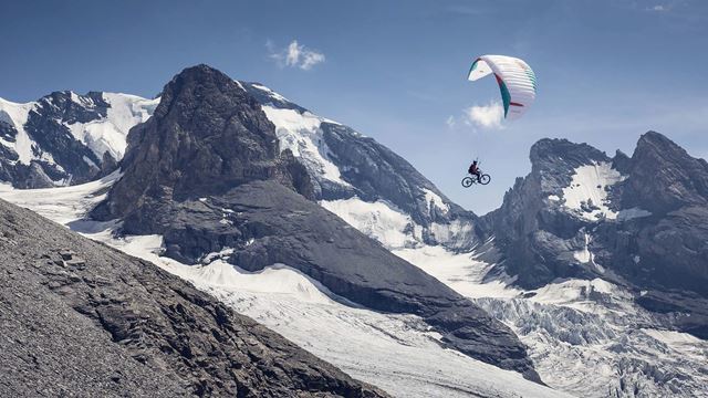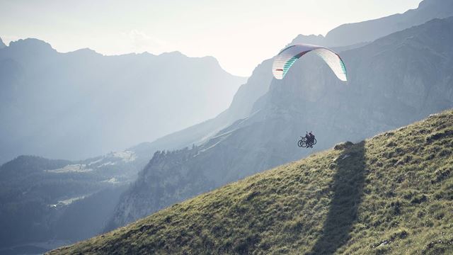 Gemeinsam trailen die beiden dann nach unten - bis ein Bikeverbot dem Spass ein Ende setzt. Zumindest dem Spass auf zwei Rädern. Schliesslich hat man ja einen Gleitschirm im Rucksack ...